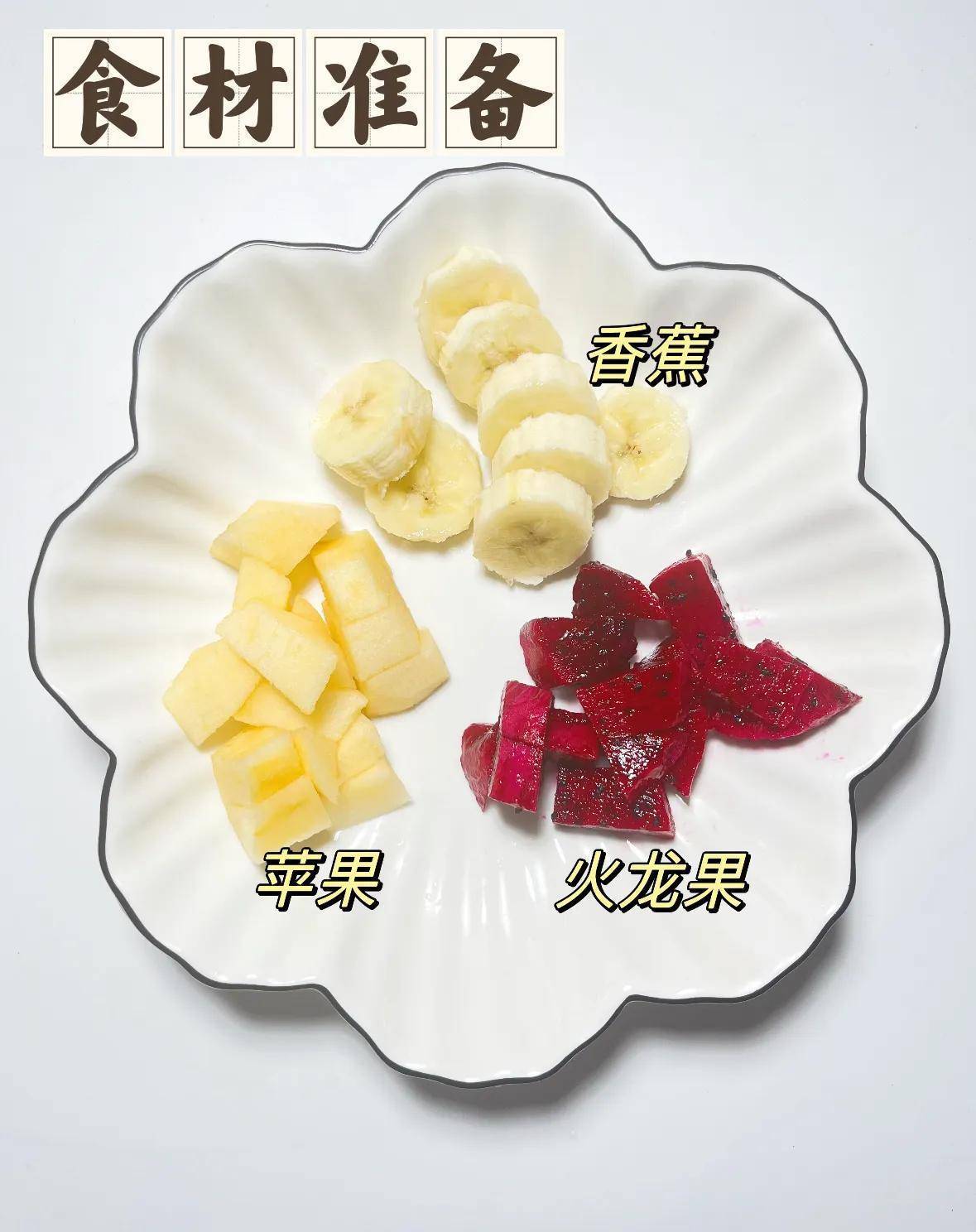 1️⃣第一步,准备食材:半个红心火龙果(选熟一些的,籽多通便效果更佳)、半根香蕉(必须是熟透的黄香蕉,青香蕉会加重便秘)、半个苹果(带皮洗净,果皮里的膳食纤维才是通便关键)。