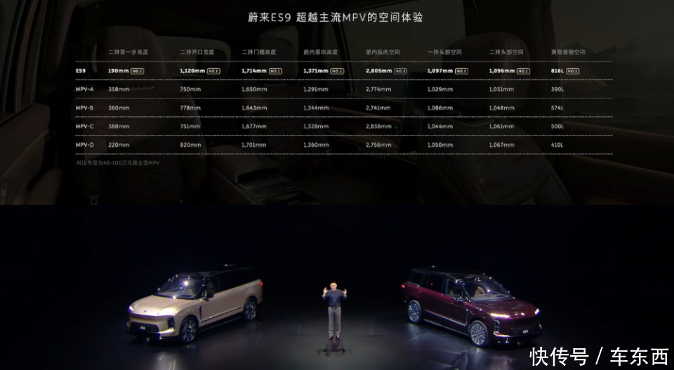 李斌现场展示,ES9的空间表现和市面上4款主流MPV的对比中均占优势,甚至直接喊出“MPV请忘记“的口号。
