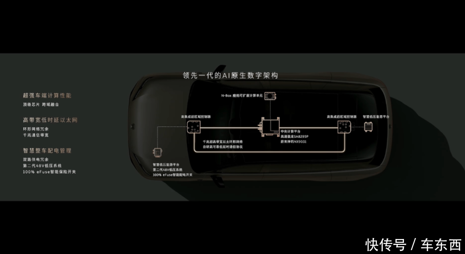 该车采用了全新的AI原生数字架构,有性能强大的车端计算性能、高带宽低时延以太网和智慧整车配电管理。
