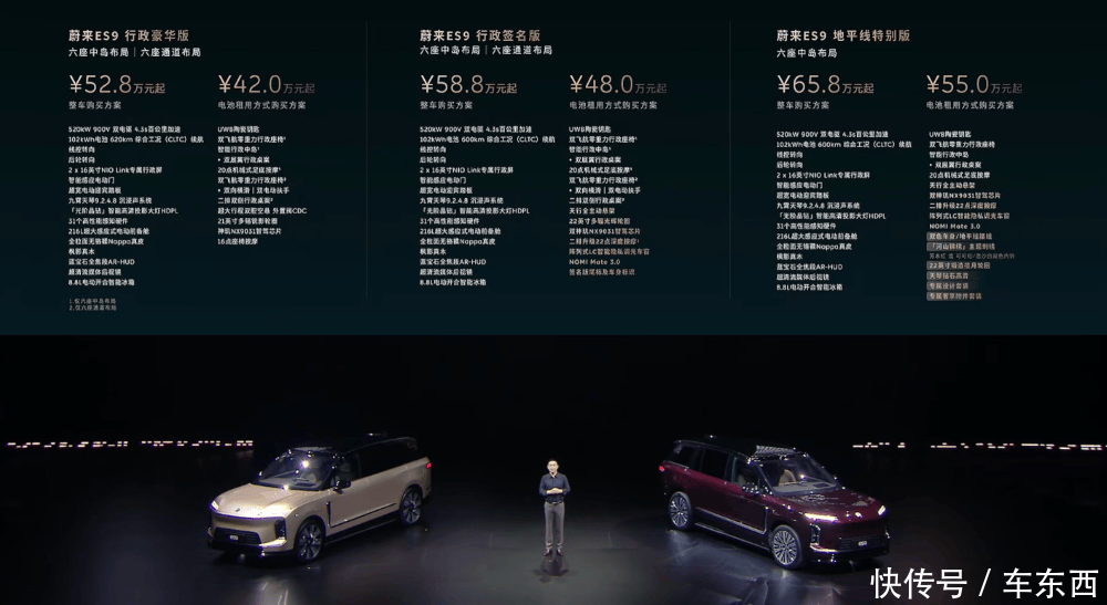 在今天的发布会上,李斌也公布了这款车的预售价格,该车一共分为三个版本,行政豪华版整车购买预售价52.8万起,电池租用模式购买预售价42万起;行政签名版整车购买预售价为58.8万起,电池租用模式购买预售价为48万起;地平线特别版整车购买预售价为65.8万起,电池租用模式购买预售价为55万起。