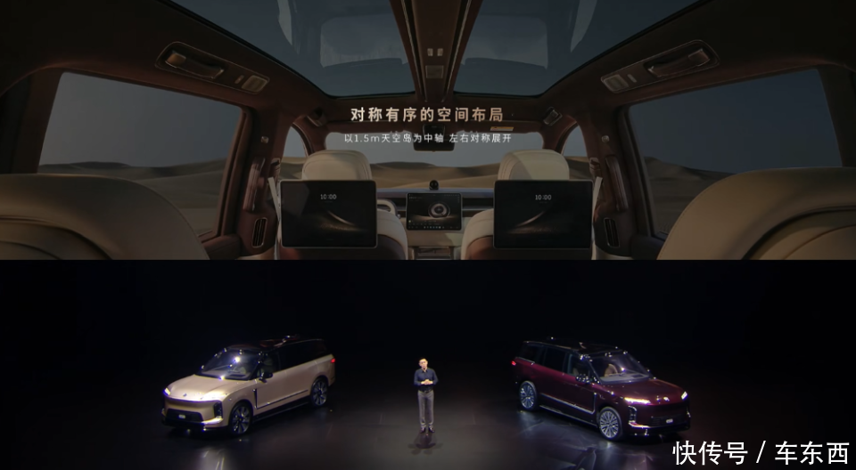 车辆内饰方面,整体采用了对称的设计风格,包括天幕也采用了对称的设计风格,整个座舱都以天幕对称展开。