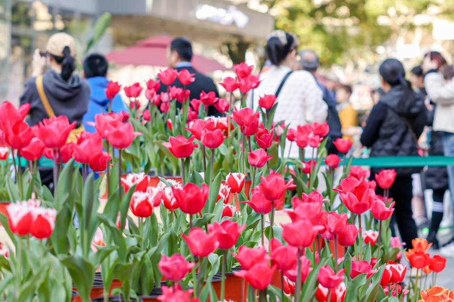 从中央广场到南北广场,成片的郁金香如期绚烂盛放。炽烈的红、轻柔的粉、点缀着金蕊的明黄,仿佛将最鲜活的春光凝固于此。目光所及,皆是繁花织就的锦绣,令人不禁放缓脚步,沉浸在这触手可及的春日梦境中。